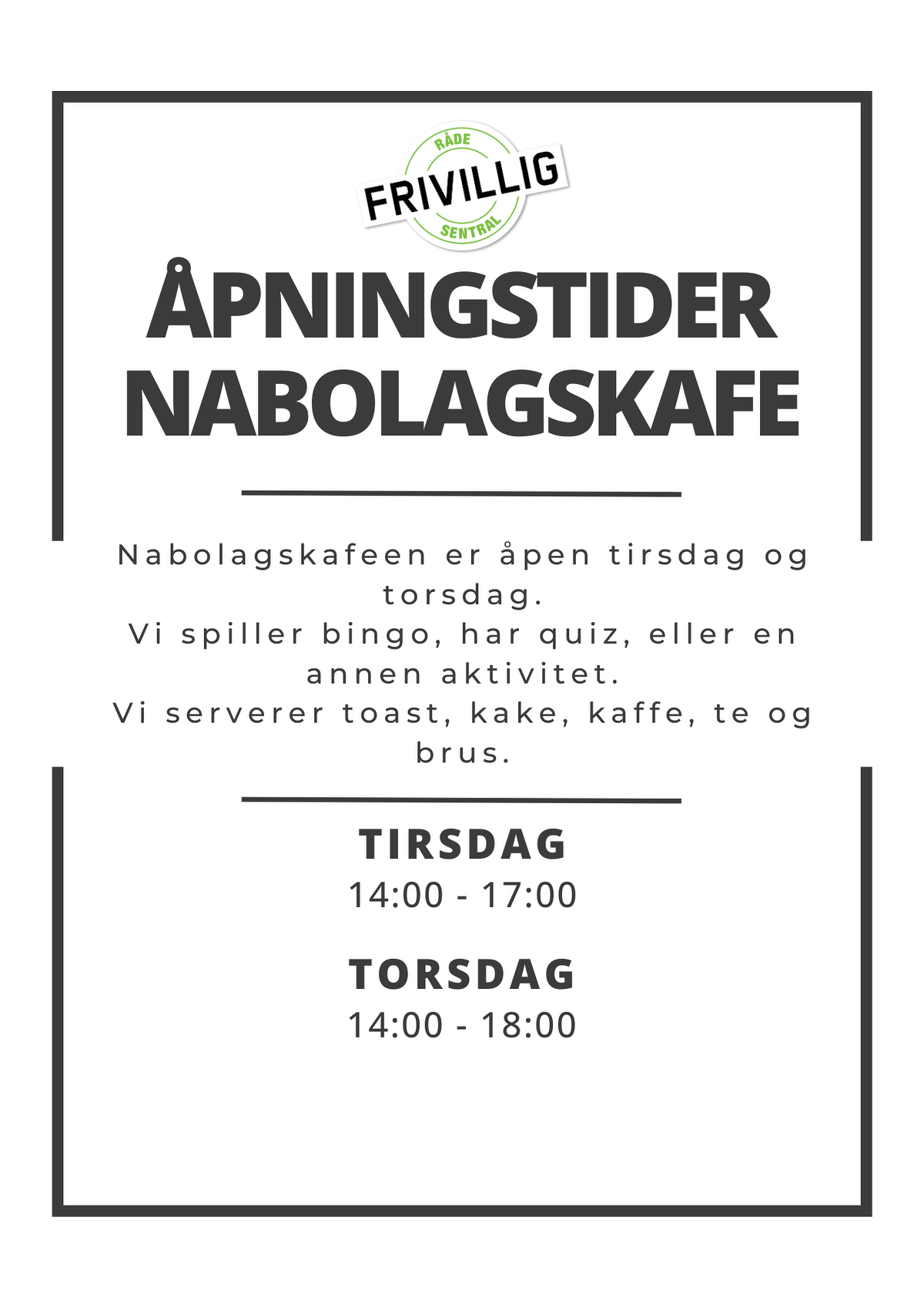 Råde Frivilligsentral driver en hyggelig nabolagskafé som holder til i Allaktivitetshuset (Huset), Skogveien 67, 1640 Råde.